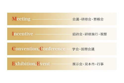 「MICE」とは、Meeting、Incentive、Convention、Exhibition/Eventの頭文字を組み合わせた、ビジネスのキーワードです。