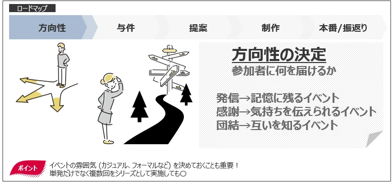 イベントを成功させるには、明確な方向性の設定が欠かせません。方向性を決める過程では、参加者に伝えたいメッセージを明確にし、それに基づいてイベントのテーマやトーン、スタイルを決定します。この記事では、イベントの方向性を決めるための重要なポイントと方法を詳しく解説します。