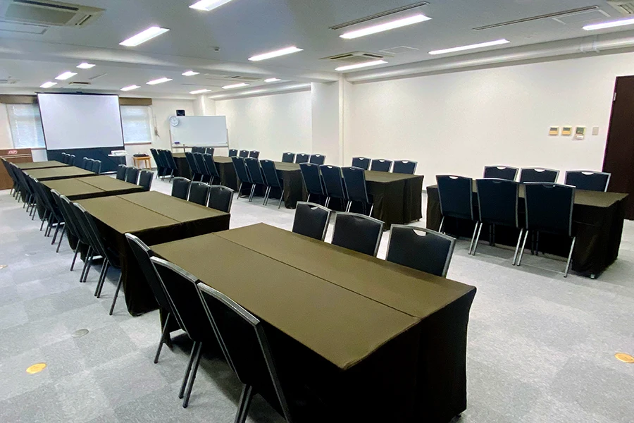 明るく広々とした空間で、研修・会議・講演会など多目的に対応。 展示会や懇親会など、フォーマルにもカジュアルにも使える柔軟性の高いスペースです。