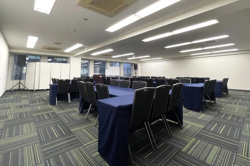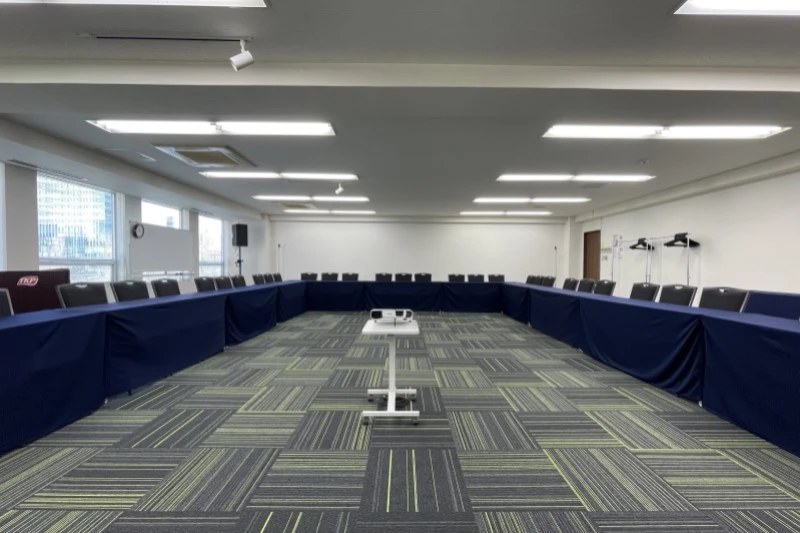 正方形の中規模会場です。 ハイブリッド型会議、セミナー、中規模社内会議で人気のお部屋です。