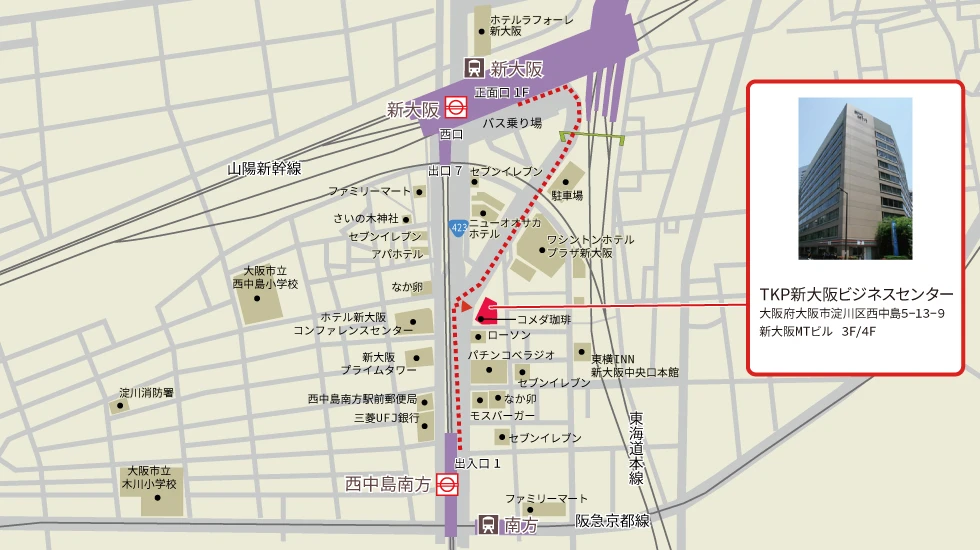大阪メトロ御堂筋線 新大阪駅 南改札7番 徒歩4分 大阪メトロ御堂筋線 西中島南方駅 北改札出口1 徒歩6分 阪急 南方駅 きた西改札口出口1 徒歩7分