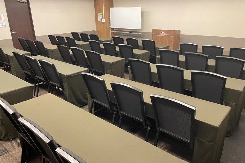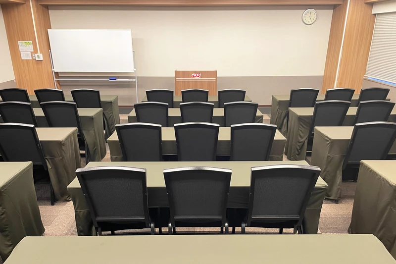 スクール形式最大45名のカンファレンスルームでございます。 会議、セミナー、試験、などの利用に最適です。 ※照明・空調は会場内で操作可能です。