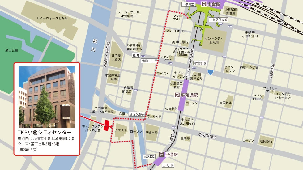 TKP小倉シティセンターTKP小倉シティセンターは北九州都市モノレール旦過駅から徒歩5分、JR小倉駅から徒歩10分の便利な立地です。面接に適した小会議室から天井高4m、最大198名収容の多目的ホールまで幅広くご用意しています。お食事は井筒屋のお弁当やパーティー料理をご利用いただけます。