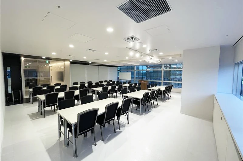 最大63名まで収容可能なカンファレンスルーム。白を基調とした清潔感のあるスタイリッシュな内装の会議室です。社内会議、研修、セミナー、ネット配信、懇親会、展示会など様々な用途に適した会場となっております。