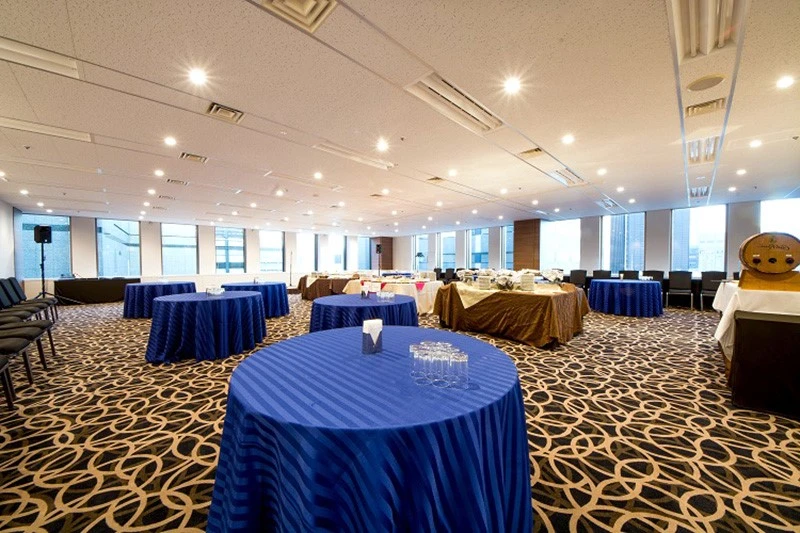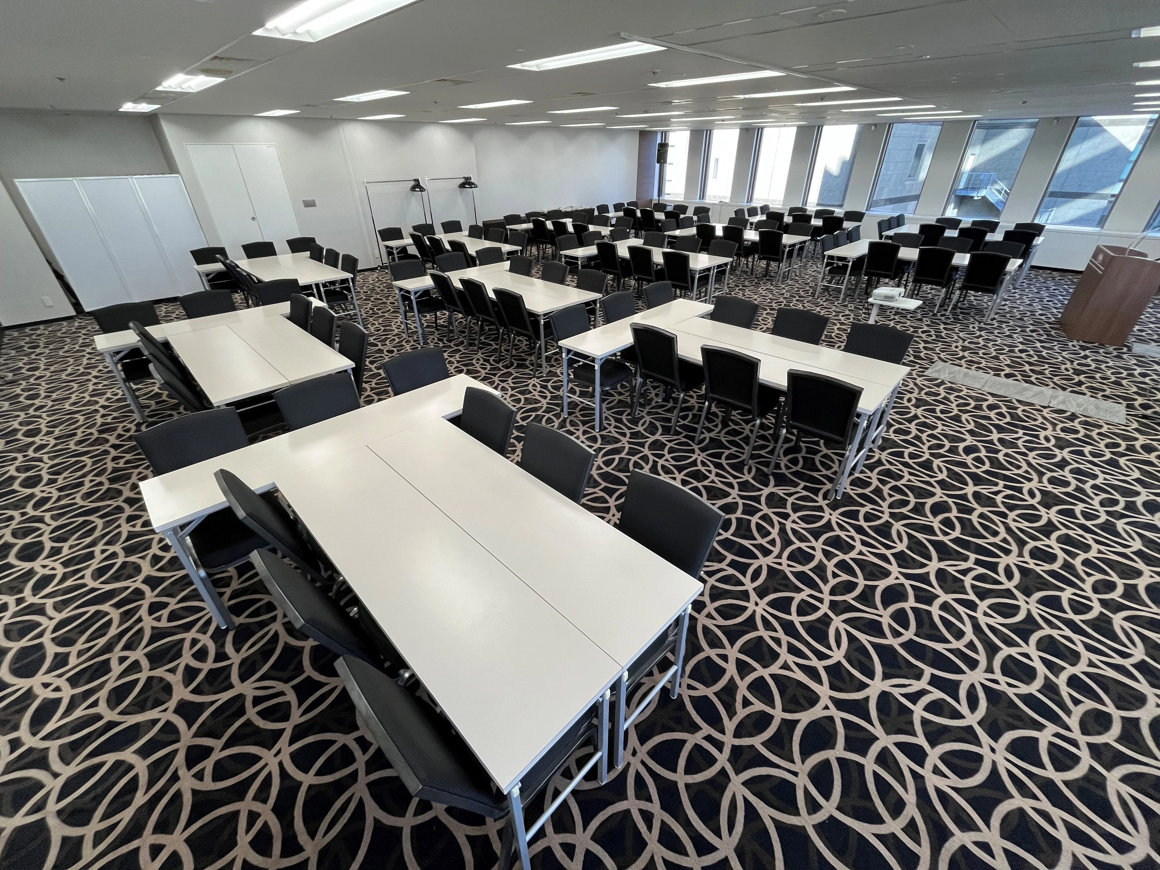 最大141名まで収容可能なホールです。社内会議、研修、セミナー、ネット配信、懇親会、展示会、資格試験等の様々な用途に適した会場となっております。