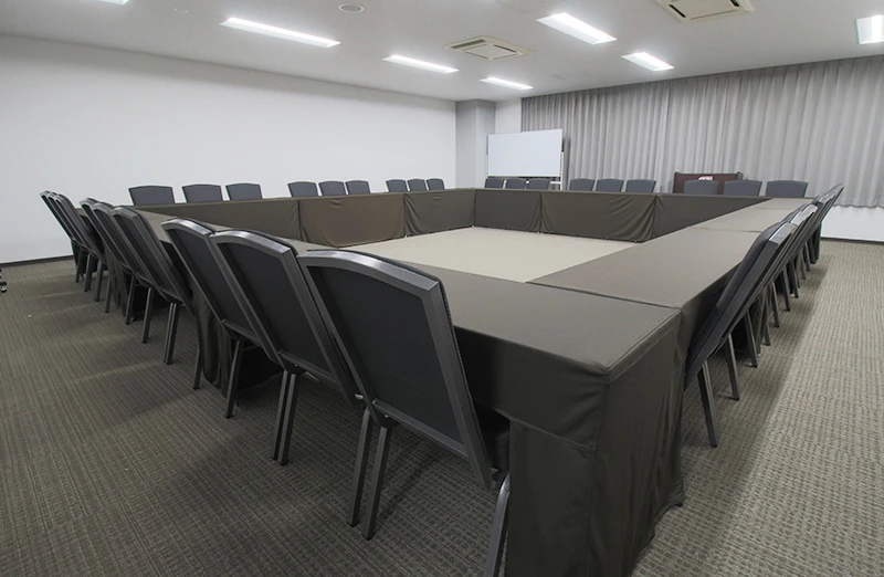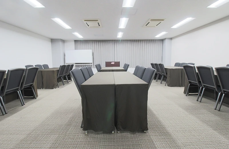 スクール形式で最大54名を収容できる中規模カンファレンスルームです。施設の最奥に位置し、静かで落ち着いた環境のため、集中しやすいとご好評いただいています。 中規模のセミナーや社内会議はもちろん、少人数での懇親会にもご利用いただけます。年間を通して利用需要が高く、リピート率の高いおすすめの会場です。