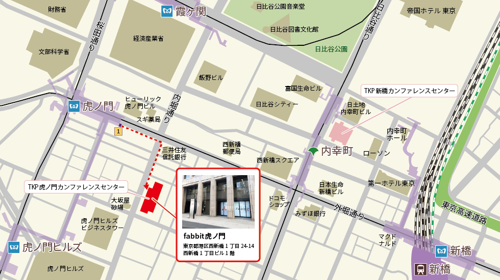 都営三田線 内幸町駅 A3出口 徒歩5分 JR線 新橋駅 徒歩8分 銀座線 虎ノ門ヒルズ駅 徒歩8分