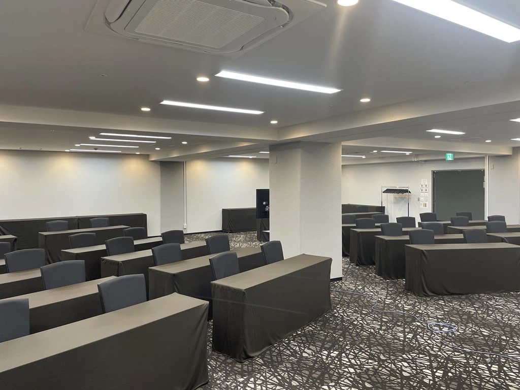 懇親会や説明会、セミナーなど幅広くご利用いただきやすい会場です。部屋中に柱が御座います。が、柱後方に常設でモニターを配置しております。個別空調完備・照明調整が可能です。