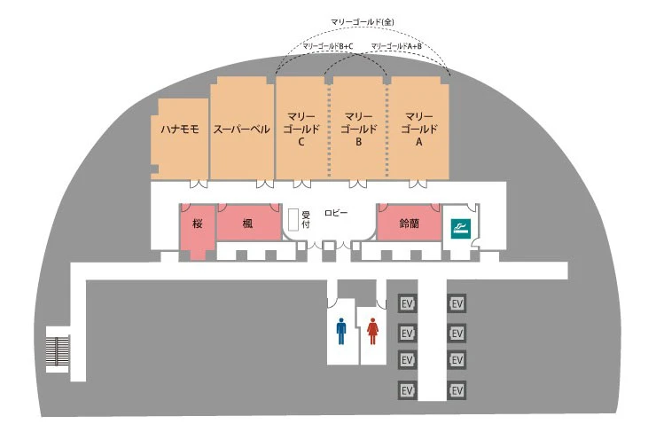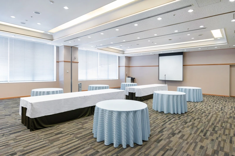 天井高3.5m、会場の質も高く、窓から見える景色も良好。セミナー、展示会、総会、懇親会等のご利用に最適な会場です。最大面積の会場のマリーゴールド(全)は、天井スピーカー・備え付けの音響卓がございますので、懇親会でのご利用時に大変好評です。東梅田(大阪メトロ 谷町線 東梅田駅上、A-TIME 梅田御堂筋店様前)より無料シャトルバス運行(平日のみ)
