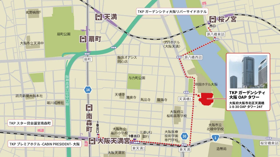 TKPガーデンシティ大阪OAPタワー天井高3.5m、会場の質も高く、窓から見える景色も良好。セミナー、展示会、総会、懇親会等のご利用に最適な会場です。最大面積の会場のマリーゴールド(全)は、天井スピーカー・備え付けの音響卓がございますので、懇親会でのご利用時に大変好評です。東梅田(大阪メトロ 谷町線 東梅田駅上、A-TIME 梅田御堂筋店様前)より無料シャトルバス運行(平日のみ)