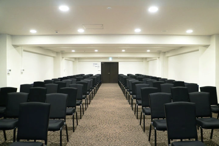 長方形の中規模会場です。 ハイブリッド型会議、セミナー、中規模社内会議で人気のお部屋です。 試験会場としてのご利用も最適な会場です。