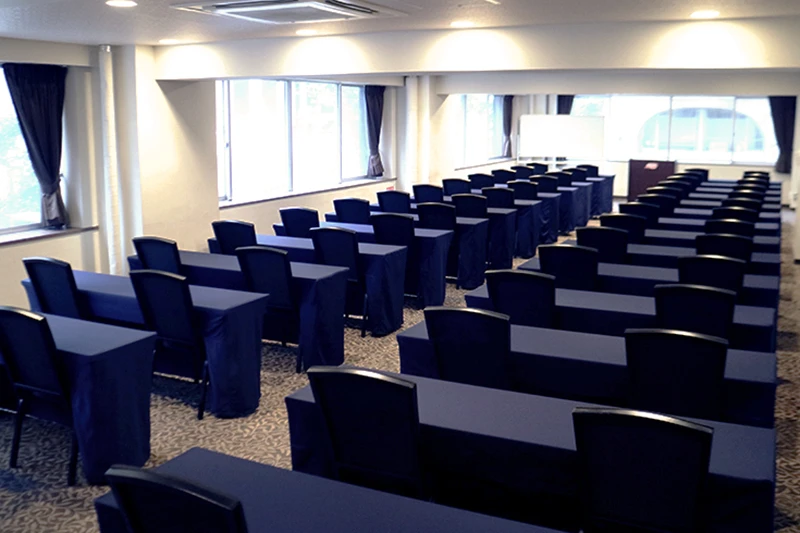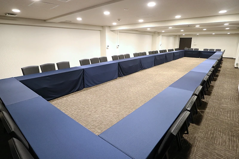 長方形の中規模会場です。 ハイブリッド型会議、セミナー、中規模社内会議で人気のお部屋です。 試験会場としてのご利用も最適な会場です。