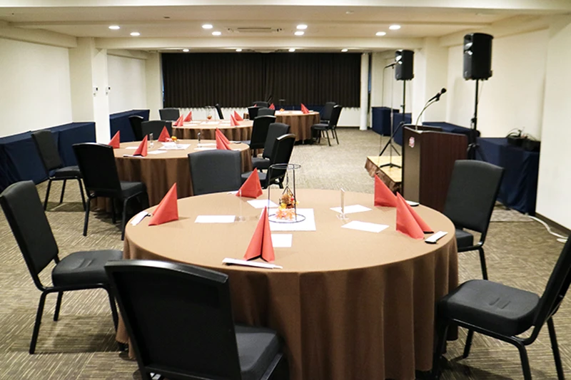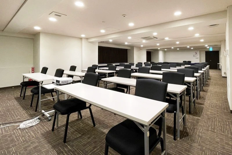 長方形の中規模会場です。 ハイブリッド型会議、セミナー、中規模社内会議で人気のお部屋です。 試験会場としてのご利用も最適な会場です。