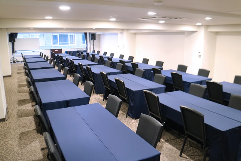 長方形の中規模会場です。 ハイブリッド型会議、セミナー、中規模社内会議で人気のお部屋です。