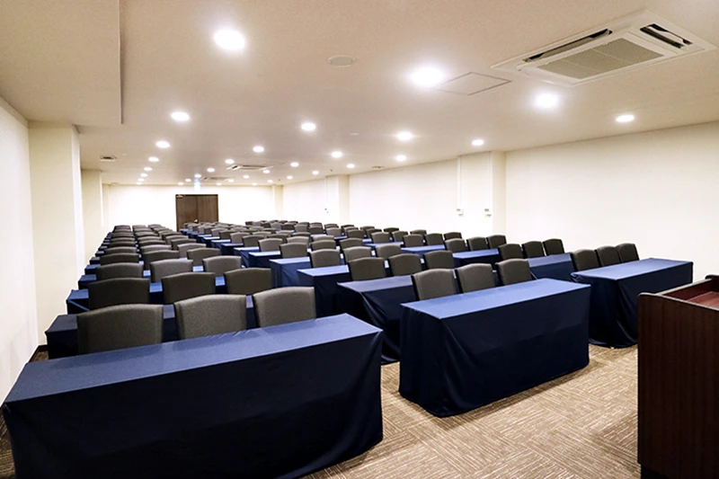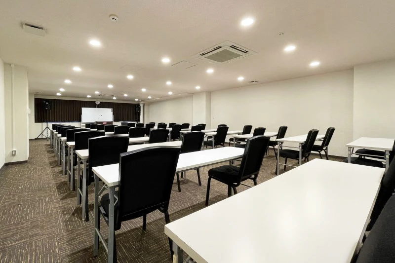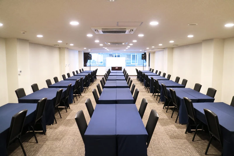 長方形の中規模会場です。 ハイブリッド型会議、セミナー、中規模社内会議で人気のお部屋です。