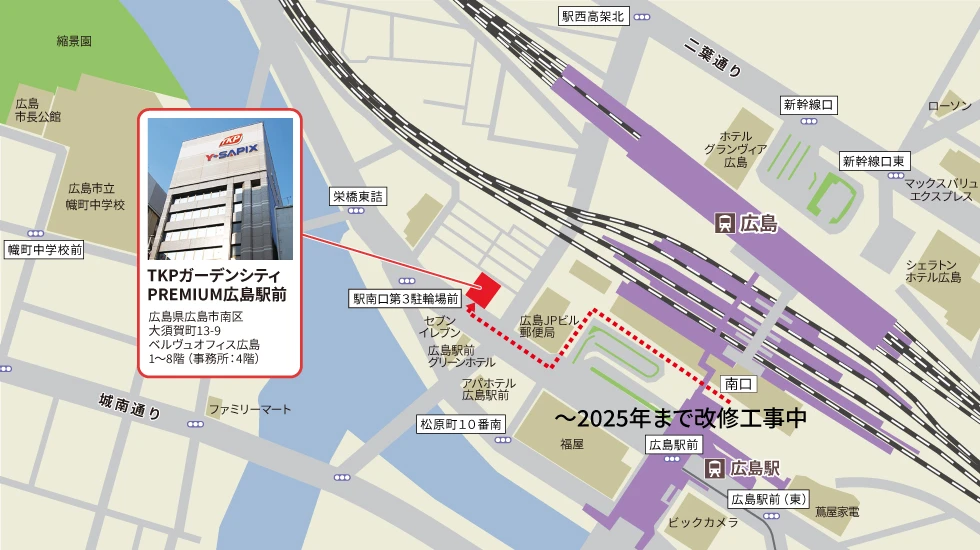 TKPガーデンシティPREMIUM広島駅前TKPガーデンシティPREMIUM広島駅前は、JR広島駅南口から徒歩2分の会議室施設です。1階から8階までのビル全体が会議室となっており、会議、研修、セミナーなど多様な用途に対応しています。館内には4階に喫煙所も設置されています。