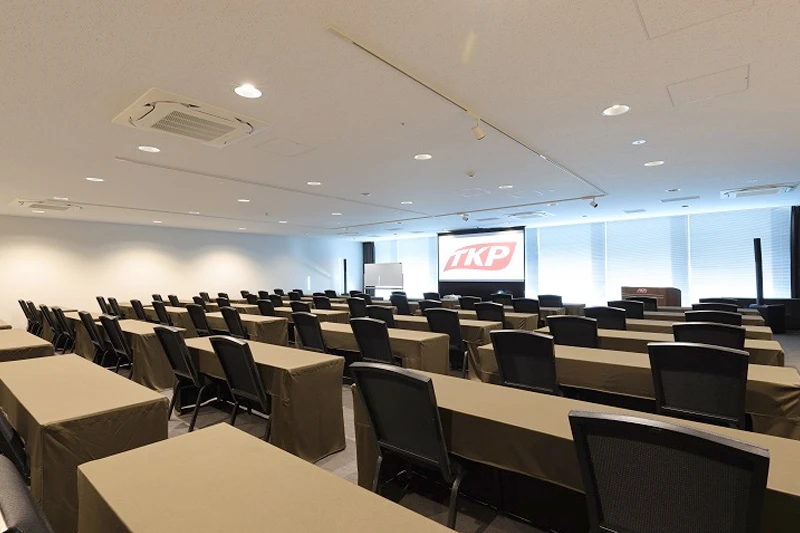 スクール形式最大108名収容の中ホール。 総会・セミナー・講演会・研修・ハイブリット配信など様々なシーンでご利用いただける! ※写真はイメージです。 ※こちらの会場は120インチスクリーンを推奨しています。