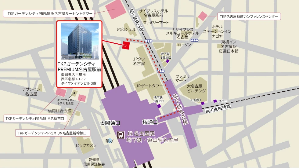 ![]() | アクセス名古屋市営地下鉄 名古屋駅 10出入口 徒歩3分名鉄名古屋本線 名鉄名古屋駅 徒歩5分 近鉄名古屋線 近鉄名古屋駅 JR線・新幹線連絡改札口 徒歩5分 |