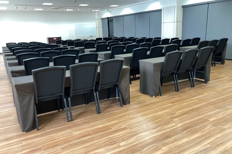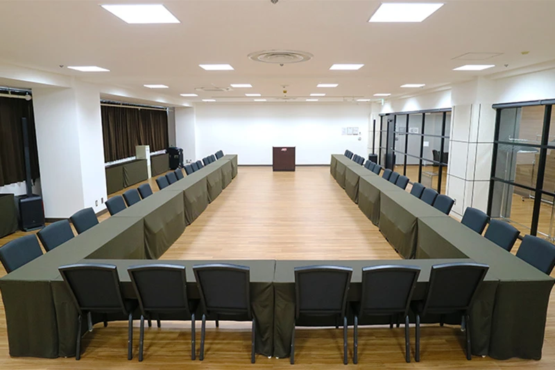 長方形の中規模会場です。 ハイブリッド型会議、セミナー、中規模社内会議で人気のお部屋です。 ガラス壁はロールカーテンで遮ることが可能です。