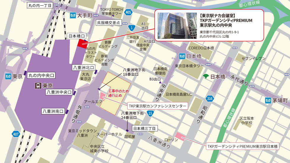 ![]() | アクセスJR線 東京駅 八重洲北口改札を出て左方向、日本橋口 直結東京メトロ東西線 大手町駅 サピアタワー連絡口 徒歩2分 東京メトロ銀座線 日本橋駅 A3出口 徒歩4分 都営浅草線 日本橋駅 A3出口 徒歩4分 |